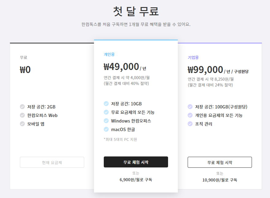 - 무료 : 비용이 무료인 대신에 저장공간은 2GB가 주어지고 한컴오피스 Web에서 사용할 수 있다.