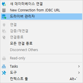 dbeaver 상단메뉴의 데이터베이스(D)를 클릭하고 드라이버 관리자 메뉴를 선택한다.