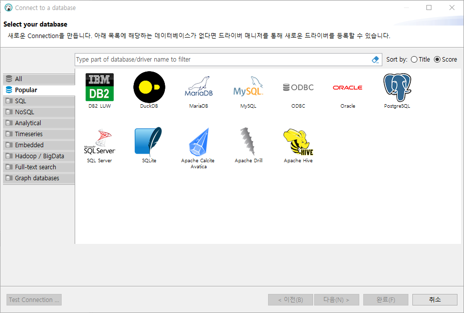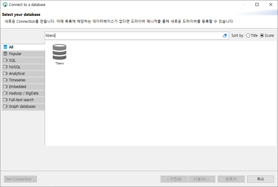 다시 Connect to a database로 와서 All 탭으로 이동해서 tibero를 검색하면 tibero가 나오는것을 확인할 수 있다.