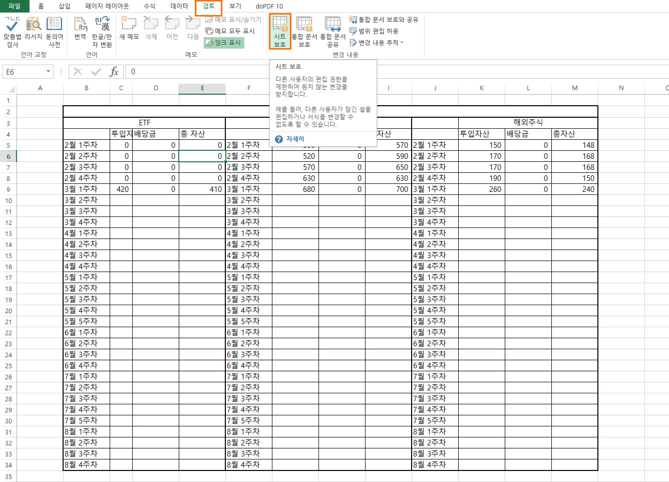 다시 이전으로 돌아가려면 시트보호 해제를 누르면 된다.