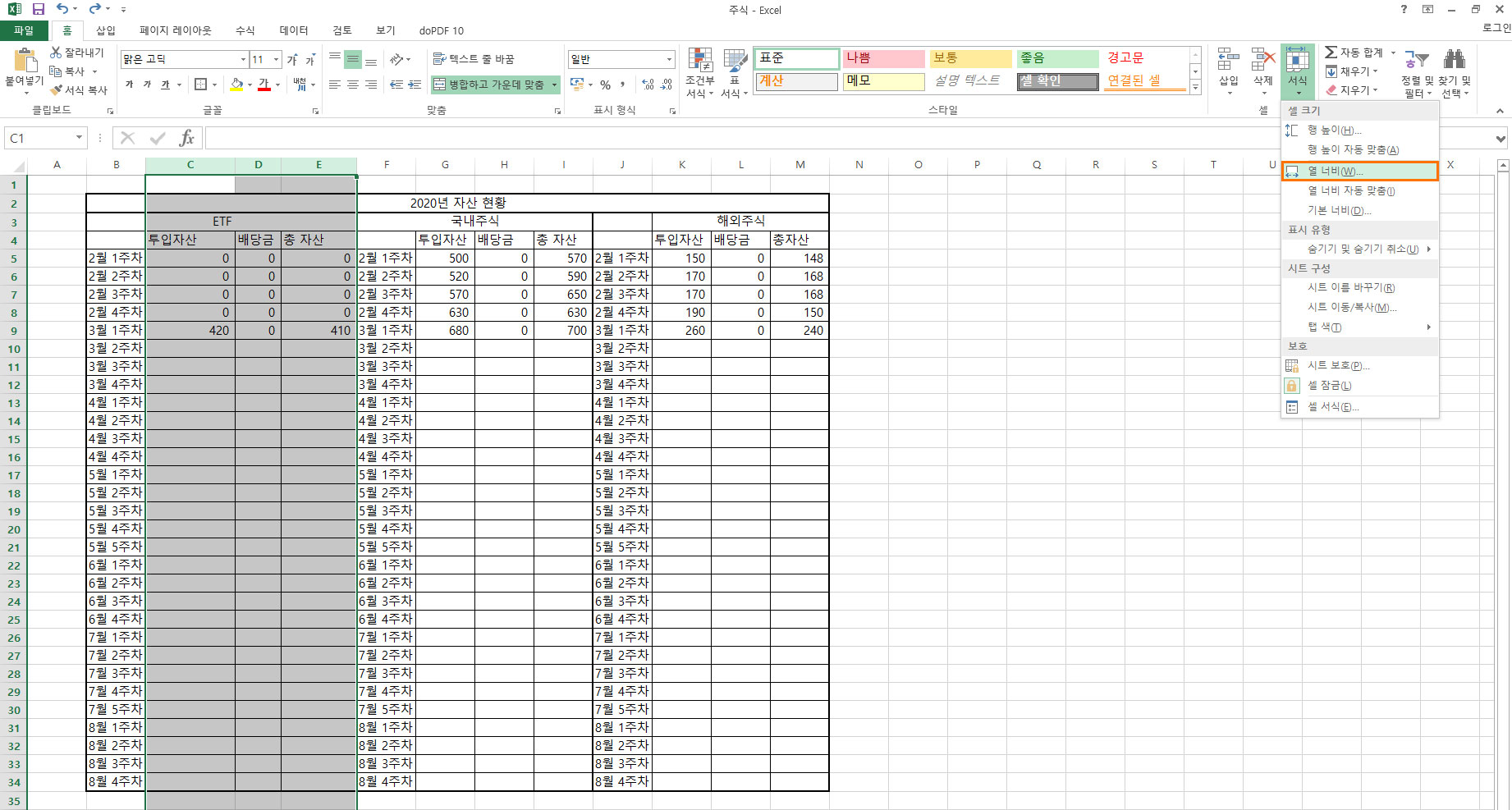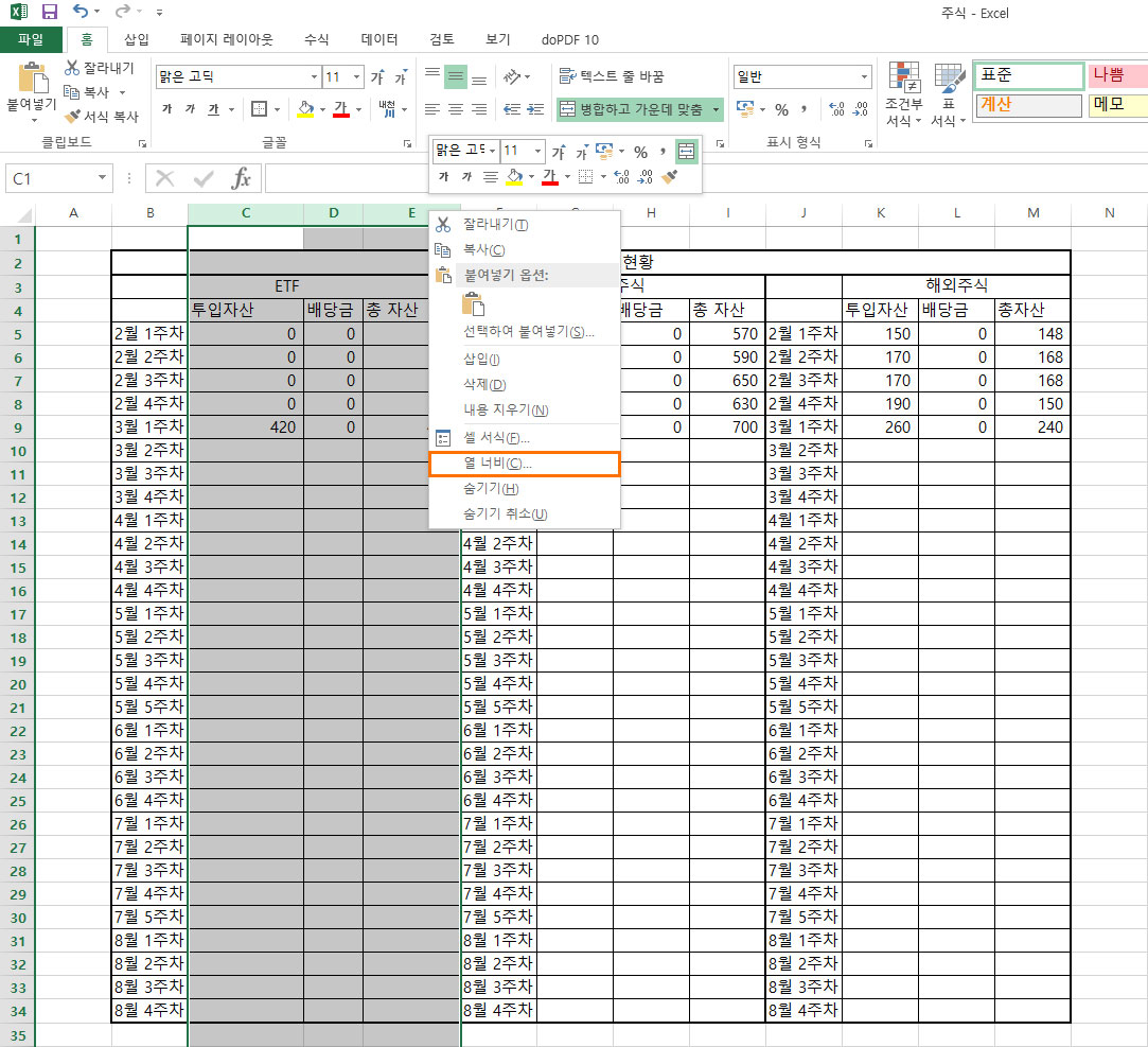 전체 선택된 상태에서 열 부분의 아무곳이나 마우스를 가져간 후 우클릭으로 열 너비를 선택하면 위와 동일한 방법으로 열 너비를 선택할 수 있다.
