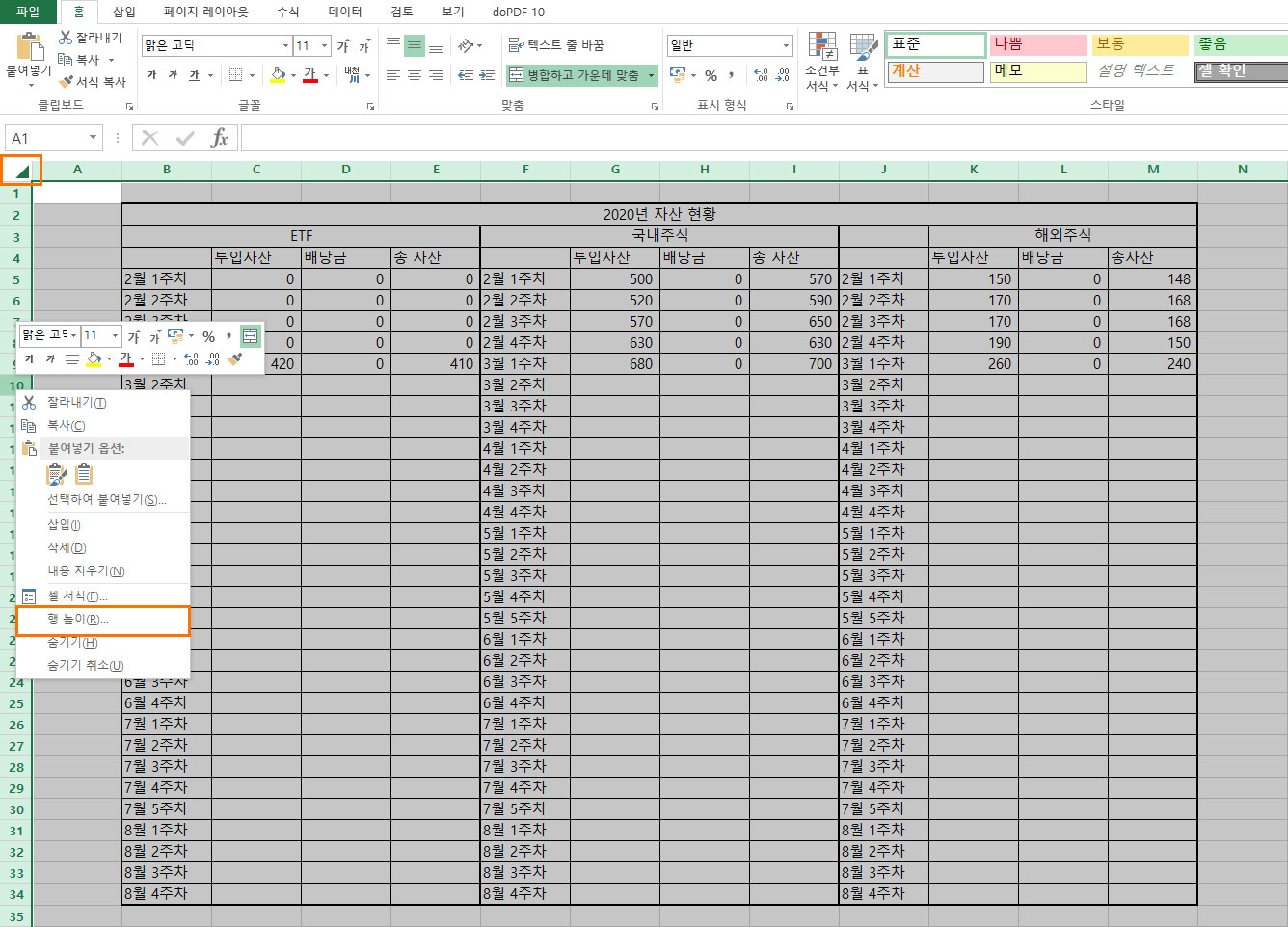 전체 행 높이를 같게 하는 방법도 전체 열을 변경하는 방법과 동일한 방법으로 변경하면 된다.