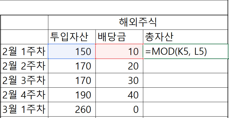 K5에서 L5를 나눈 나머지 값을 출력한다.