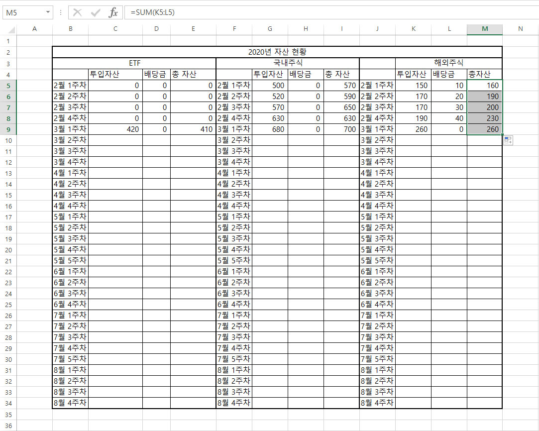 =SUM(K5, L5) 를 입려하고 ENTER치면 된다.