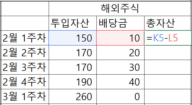 K5에 있는 값에서 L5에 있는 값을 뺀다는 뜻이다.
