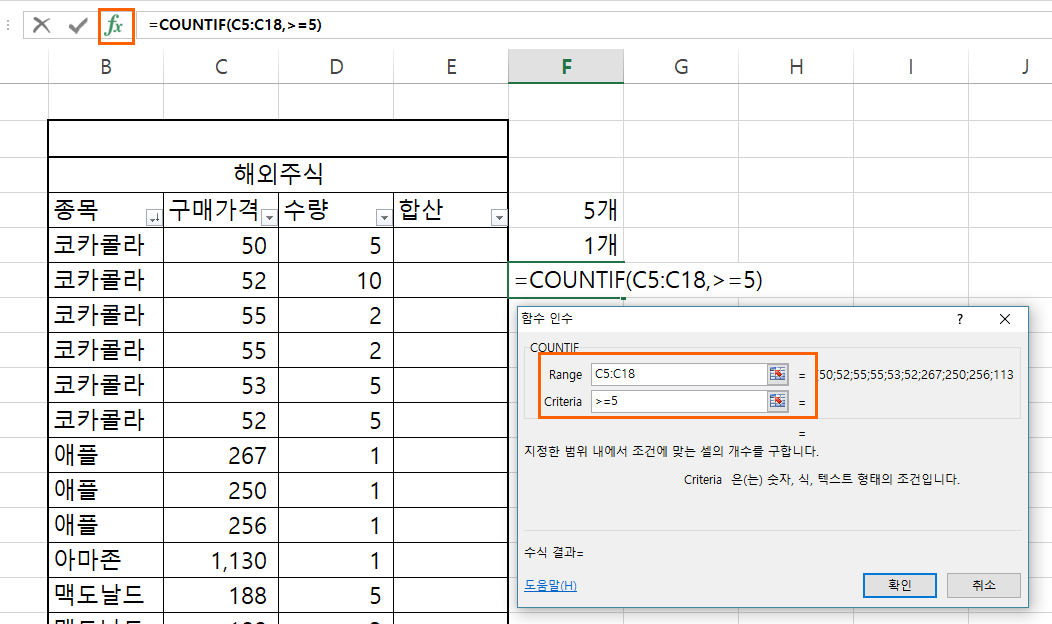 COUNTIFS 함수는 여러 조건을 걸수 있기 때문에 종목이 맥도날드이고 수량이 5개 이상인 조건으로