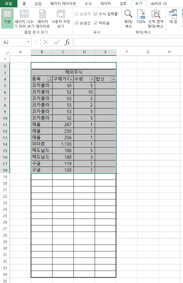 다른 하나는 상단 메뉴의 보기로 탭 이동 후 페이지 나누기 미리 보기를 클릭하는 방법이 있다.