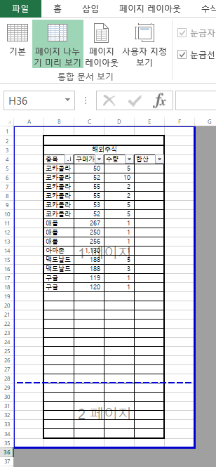 페이지 미리 보기를 선택하면 1페이지, 2페이지 .... 로 페이지가 나뉘로 파란색 점선과 실선으로